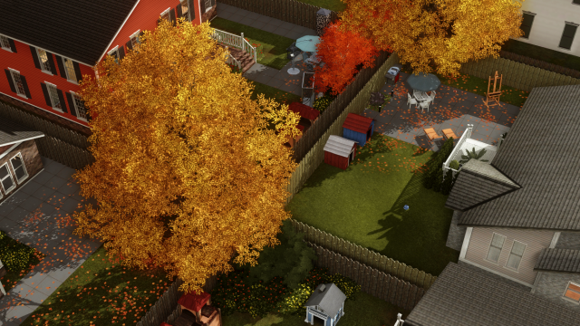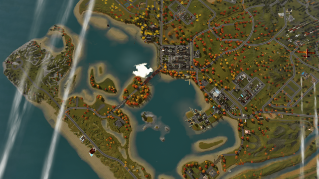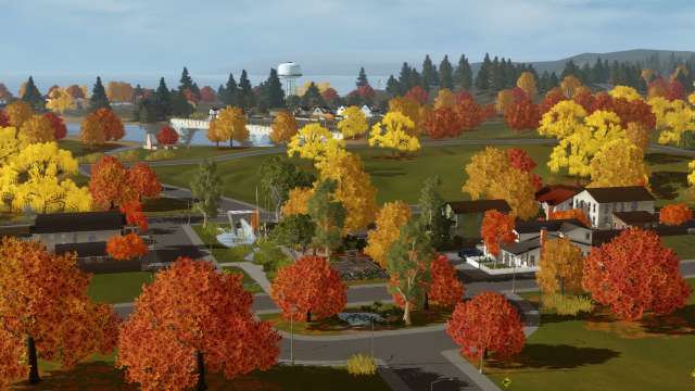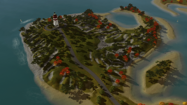 Акадия - это мир на восточном побережье Канады, и у него есть небольшая предыстория, которую вы можете найти в документации, предоставленной создателем. Он отличается богатым разнообразием окружающей среды, как с рельефом, так и с пейзажами, которые кажутся невероятно реалистичными. От традиционного центра маленького городка до уютных пригородных кварталов и даже более отдаленных, труднопроходимых районов, таких как густые леса и длинные полуострова, ландшафт отличается тихой, но в то же время величественной красотой. Мое любимое место - полуостров, показанный на рис. 4. Здесь волны разбиваются о скалистый берег под живописным маяком, а морские птицы парят и ныряют над головой. Густые вечнозеленые растения и яркая осенняя листва усеивают местность, создавая прекрасный контраст с бирюзовыми водами, которые являются одновременно спокойными и манящими.