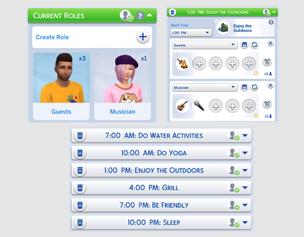 Каждый пункт расписания может обладать своими занятиями, ролями и нарядами, что позволит вам выбирать разное поведение симов в течение дня. Ваша поездка может быть расслабляющим съездом рыболовов с утра и жаркой вечеринкой вечером.